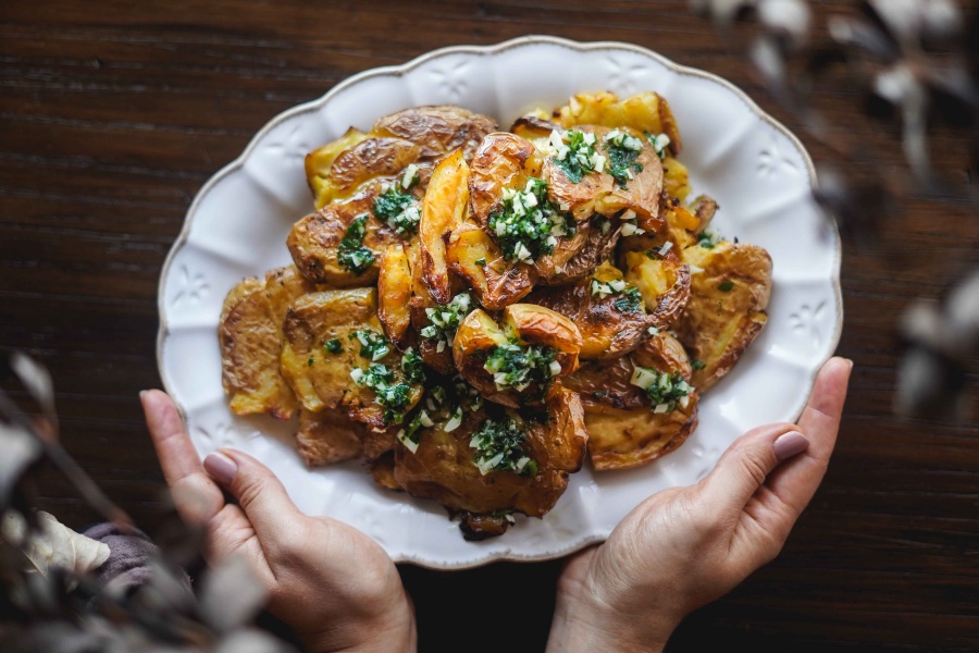 - Retire as batatas da panela (reserve a água) e esmague-as com a panela. Disponha-as sobre a cama de cebola e alho e tempere com azeite, vinagre de maçã e pimenta preta. Leve a assar a 180ºC, durante 50 minutos.