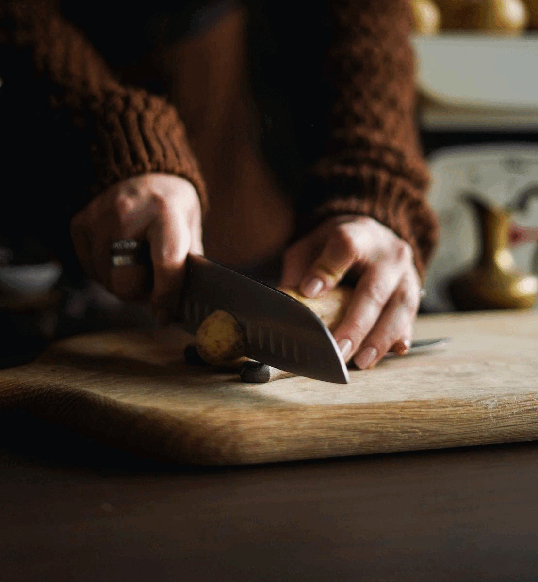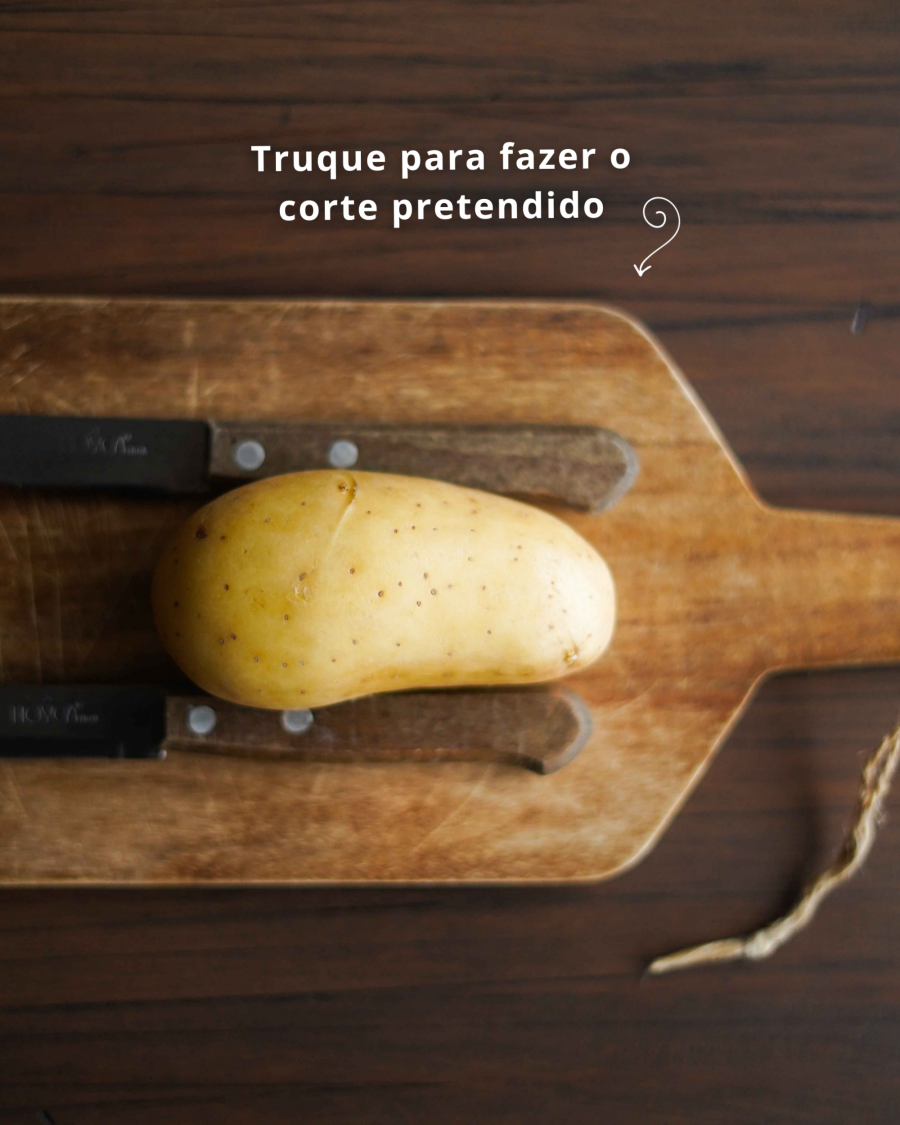 Mas como fazer este corte nas batatas, perguntam vocês! A boa notícia é que não precisam de nenhum utensílio específico. Basta uma boca faca e 2 facas pequenas ou 2 colheres de pau para “segurar” a batata.