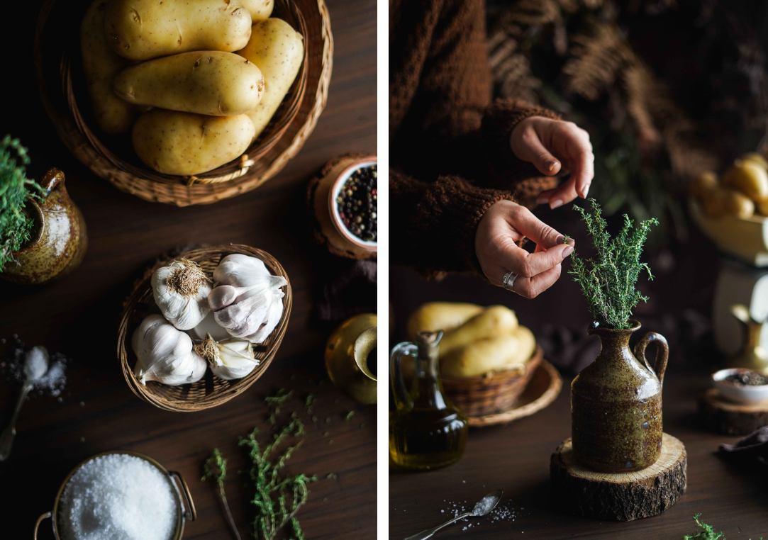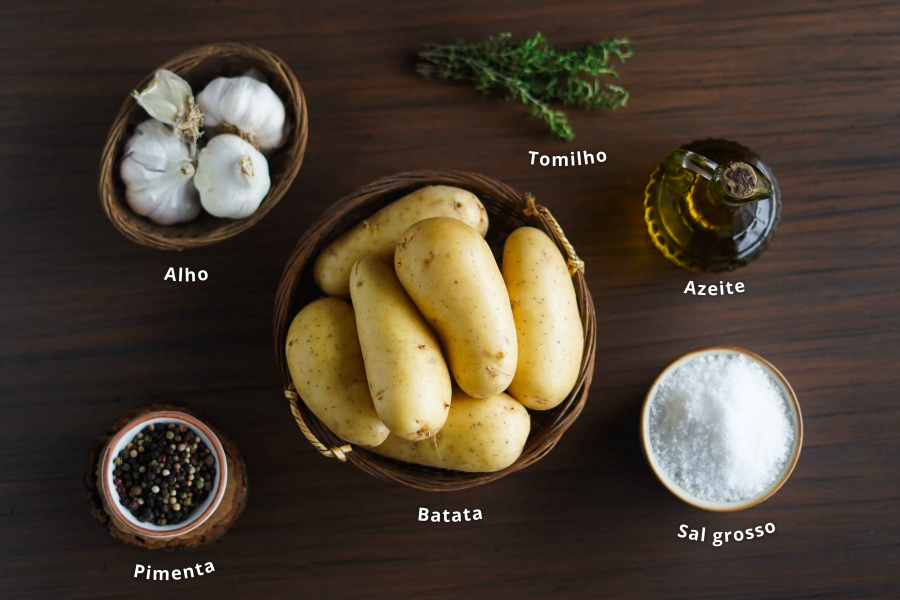 - Tempere as batatas com sal grosso, pimenta preta, tomilho e azeite.