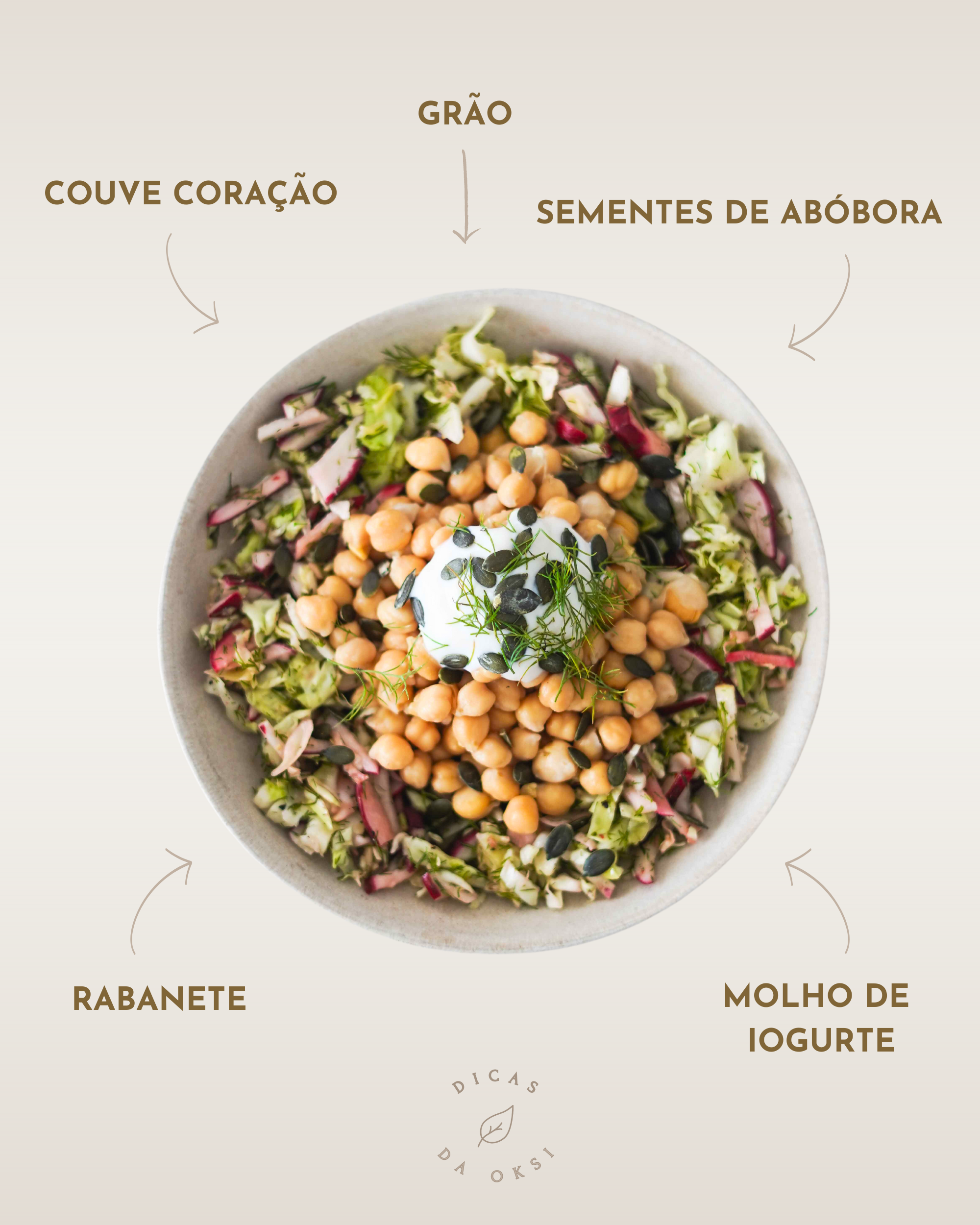 - Monta a salada, colocando a base de couve e rabanetes, seguida do grão-de-bico, molho de iogurte e sementes de abóbora.