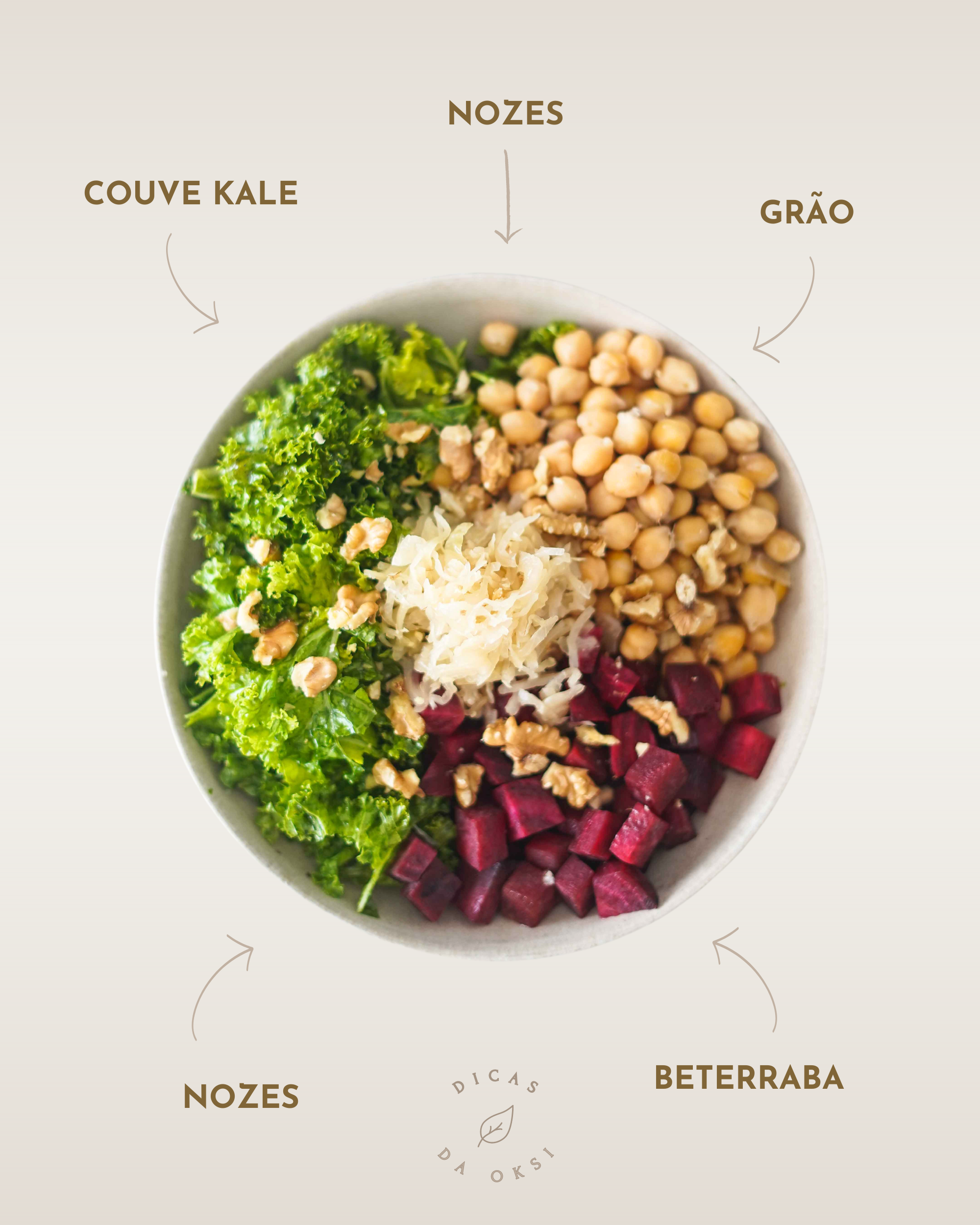 - Quando a beterraba estiver pronta, monta a salada. Coloca num prato a beterraba com os alhos assadas, a couve kale massajada, o grão cozido, o chucrute e as nozes picadas. Está pronta!