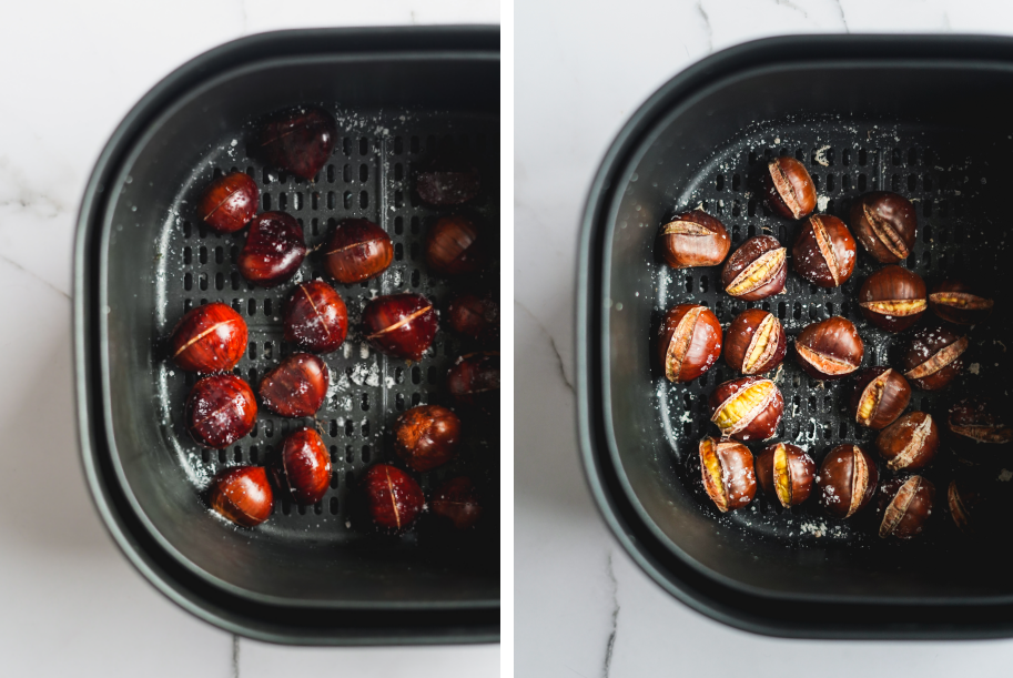 Se não tiveres uma airfryer, podes utilizar a mesma técnica para preparar castanhas no forno! Demolha-as igualmente em água salgada, escorre e, depois disso, leva a assar no forno. Deves assar num forno pré-aquecido a 190ºC – 200ºC, durante cerca de 30-40 minutos.