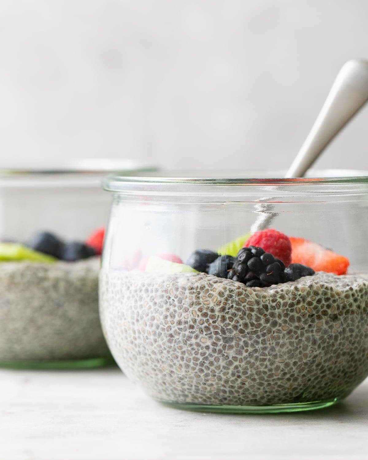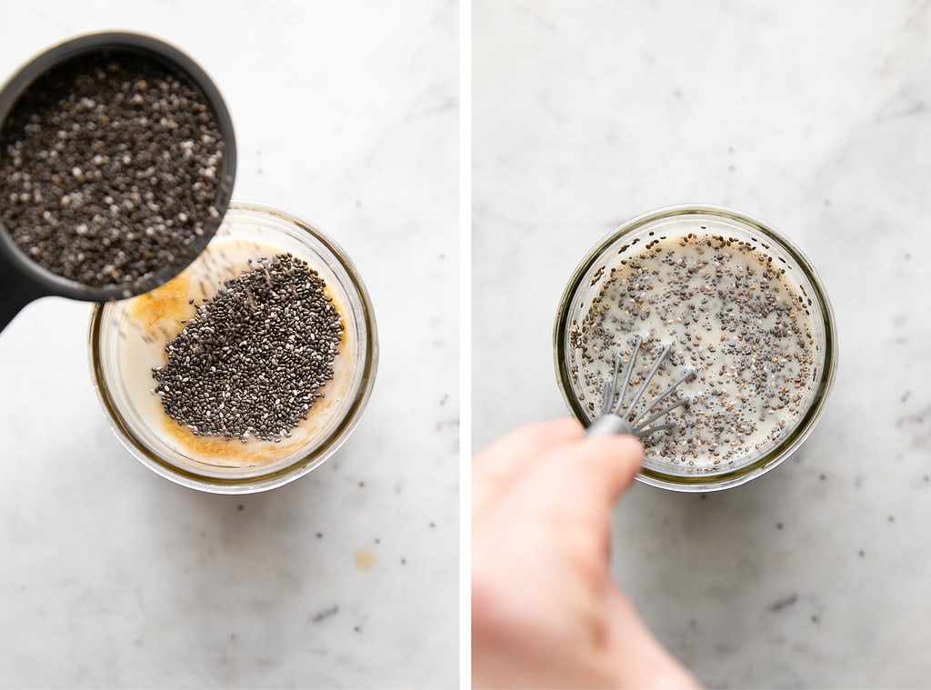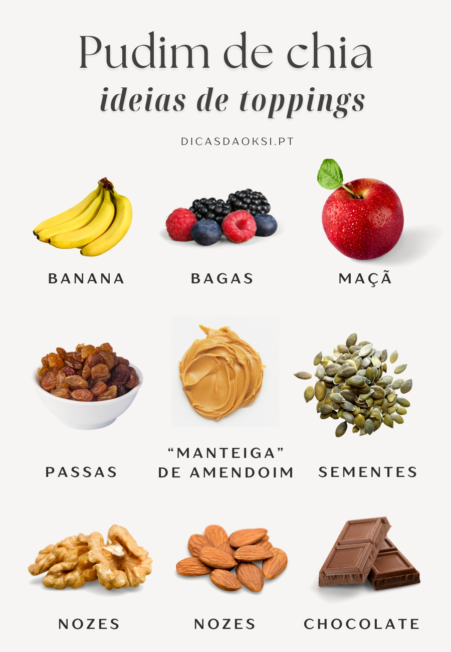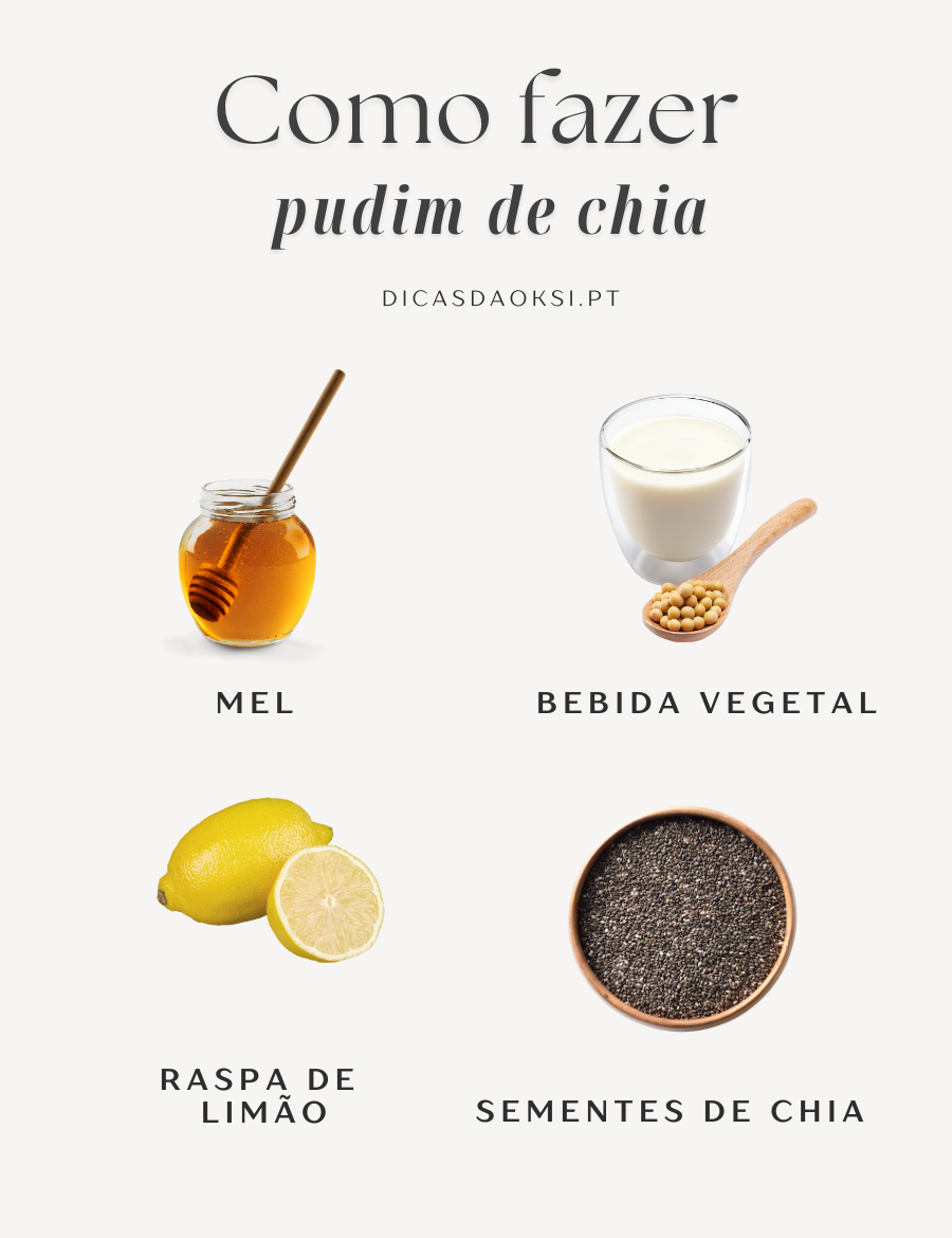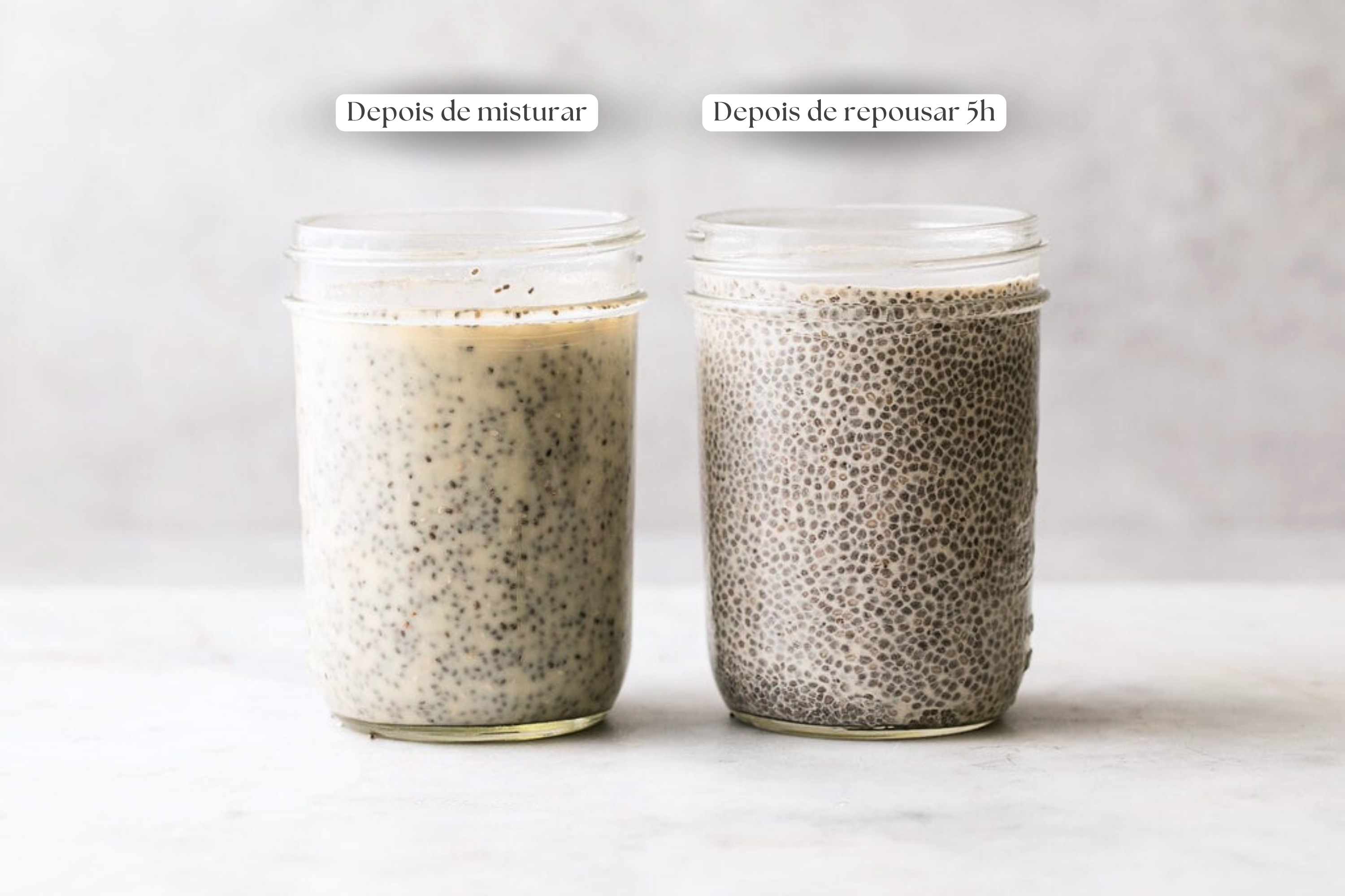 Um pudim de chia são essencialmente sementes de chia demolhadas em bebida vegetal e/ou iogurte. Ao entrarem em contacto com líquido, as sementes de chia vão inchar bastante.