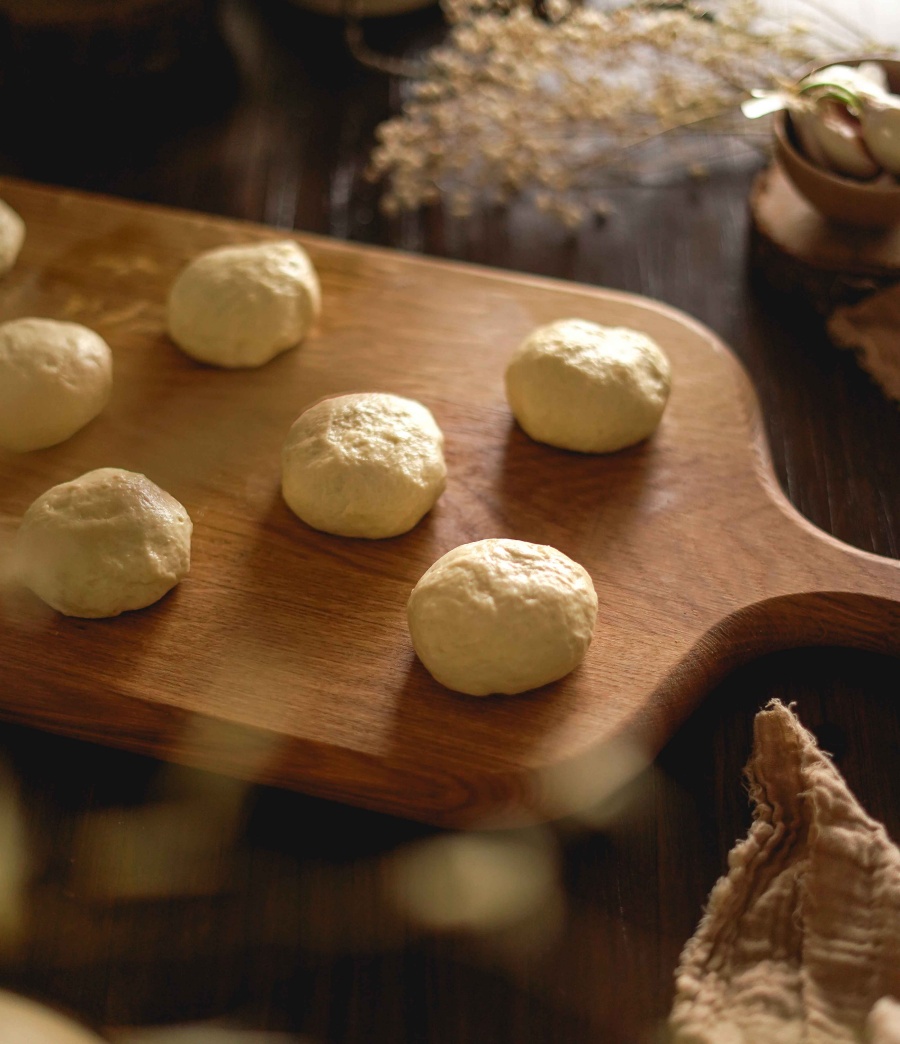 - Quando a massa duplicar de tamanho, volte a amassá-la ligeiramente, até perder o ar. Divida a massa em 8 porções iguais e faça 8 bolas. Deixe as bolas de massa descansar durante mais 15min.