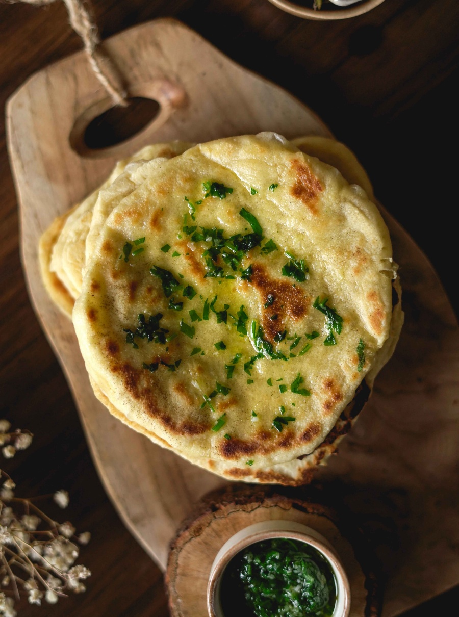 Pode fazer este pão naan simples ou então finalizar com diferentes ervas aromáticas, por exemplo: