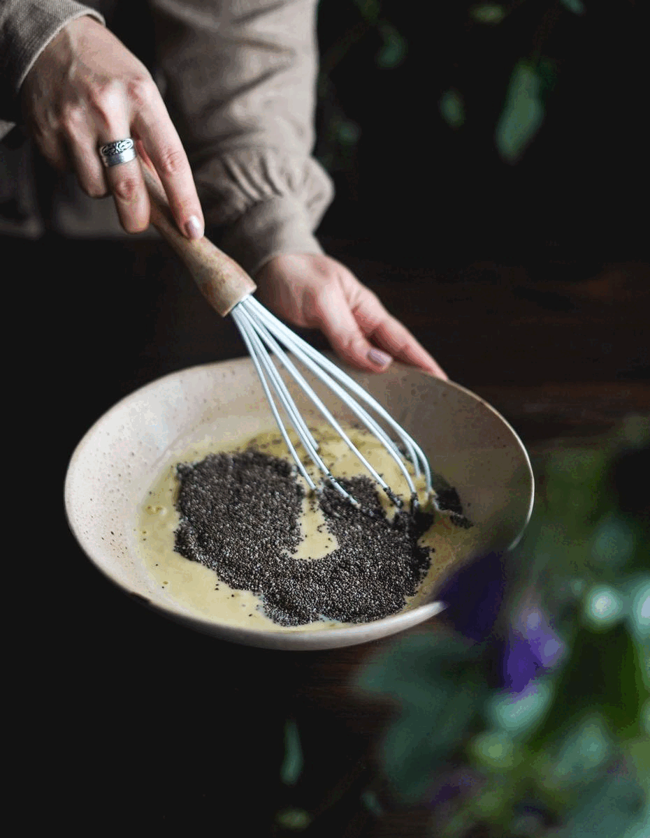 - Transfira esta mistura para um recipiente e adicione as sementes de chia. Misture bem com uma vara de arames.