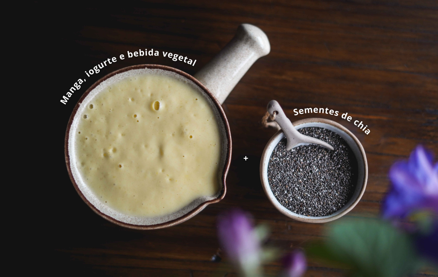 - Coloque numa liquidificadora a polpa da manga, a bebida e o iogurte vegetal. Processe tudo até ficar bem cremoso.