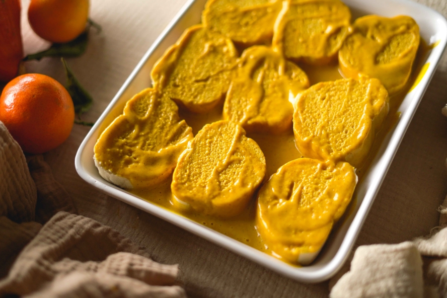 - Disponha as fatias de pão numa travessa e regue-as com o molho. Vire as fatias, garantindo que ficam bem demolhadas de ambos os lados.