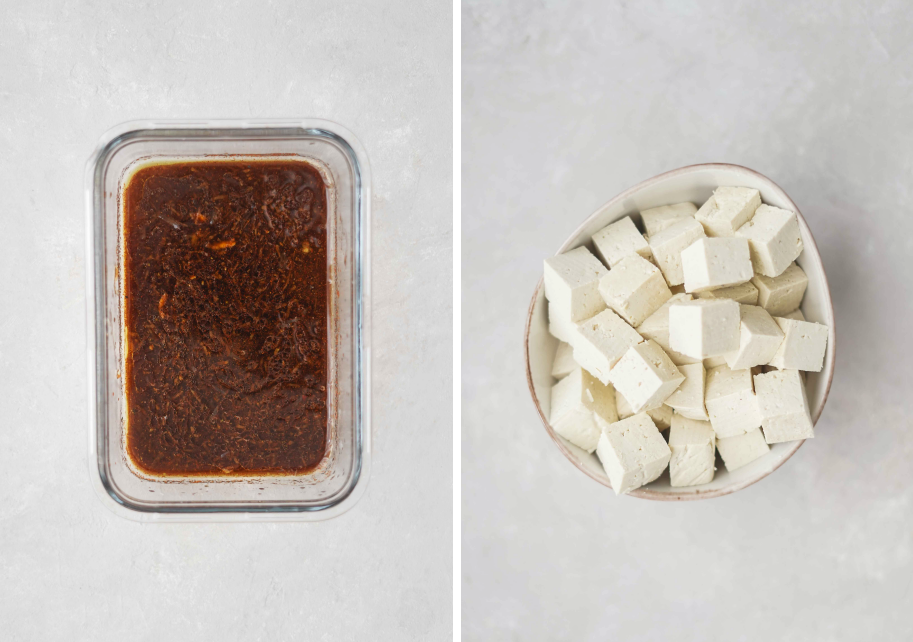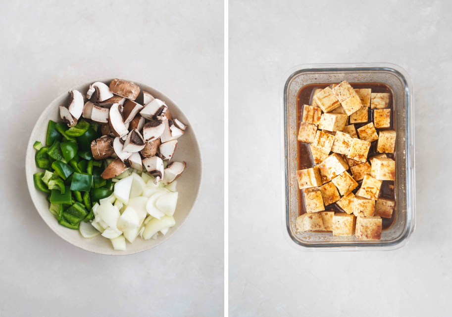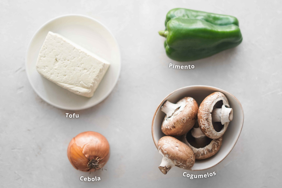- Adicione o tofu, a cebola, os cogumelos e a curgete. Misture bem e deixe marinar no frigorífico durante pelo menos 30 min (pode deixar até 12h).