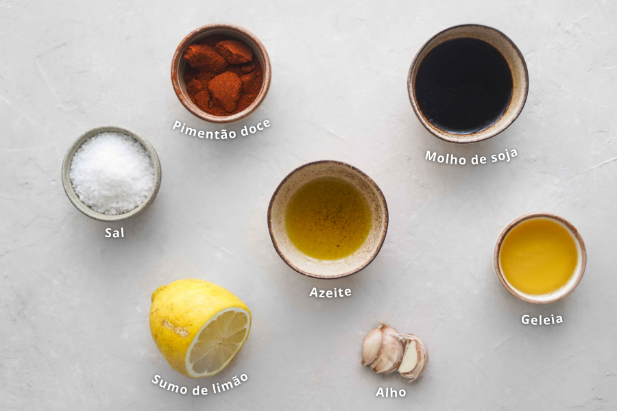 - Coloque num recipiente grande todos os ingredientes da marinada (o azeite, o molho e soja, o sumo de limão, o pimentão fumado, o sal grosso e a pimenta preta. Misture bem.