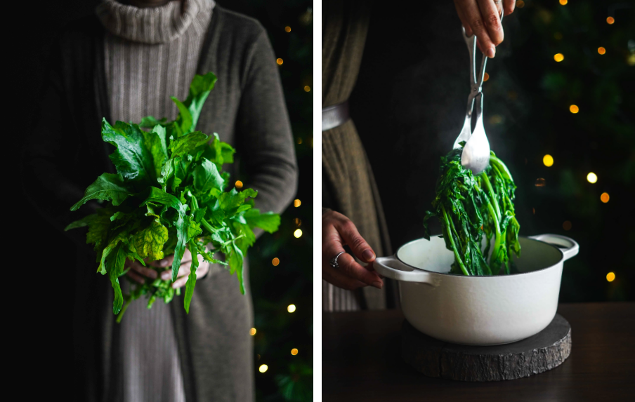 Para acompanhar, vamos ter dois elementos bem tradicionais – as batatas os e grelos.