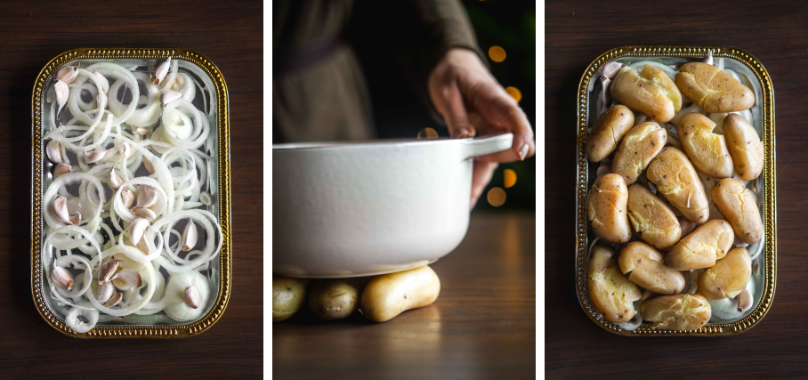 - Retire as batatas da panela (reserve a água) e esmague-as com a panela. Disponha-as sobre a cama de cebola e alho e tempere com azeite, vinagre de maçã e pimenta preta. Leve a assar a 180ºC, durante 50 minutos.