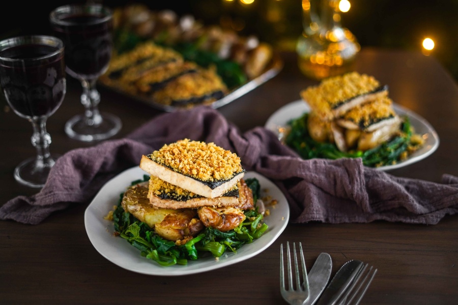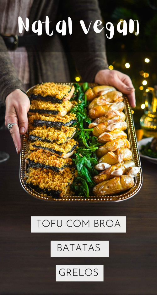 Trago-vos uma sugestão festiva, perfeita para o Natal Vegan – Tofu com broa, batatas e grelos!